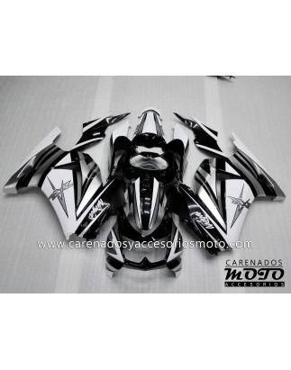 Carenado completo Kawasaki EX 250 2008-2012 compuesto por 15 piezas, que incluye frontal, laterales medios, quillas, (opcional depósito completo), colín, guardabarros delantero y piezas auxiliares.